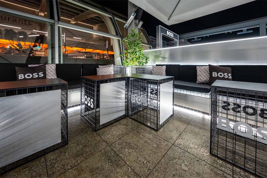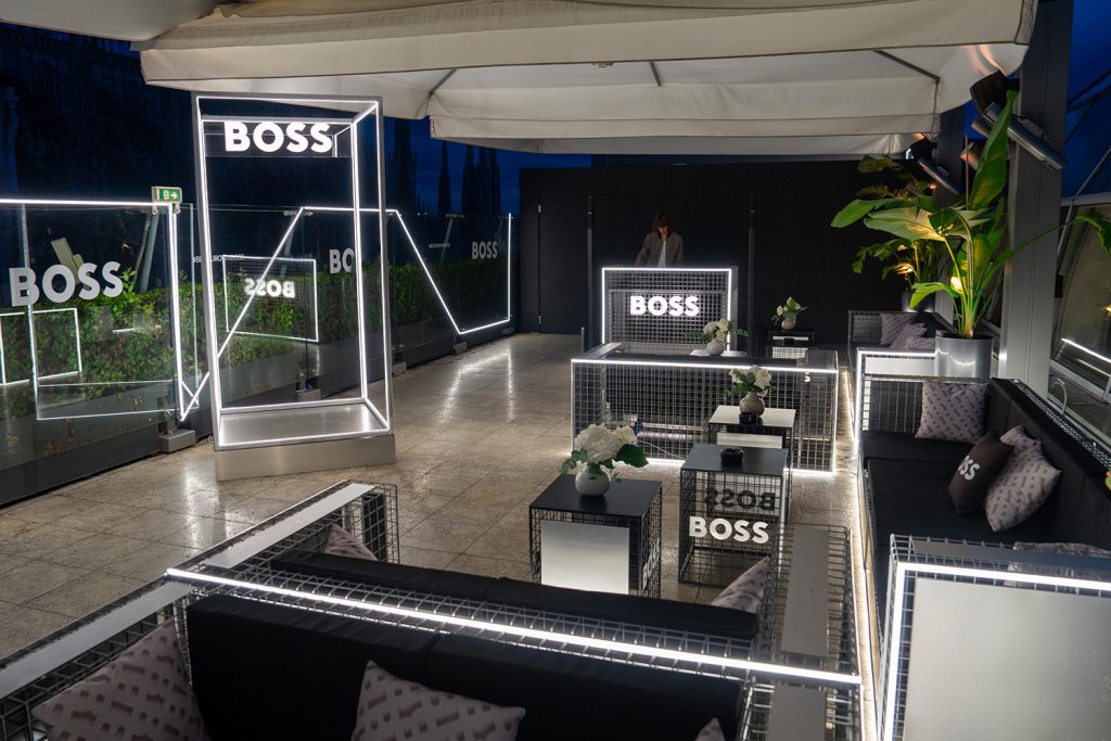 The greatest takeover of the Terrazza Rinascente Milano during the Milano Fashion Week 2023. All the furniture and decoration were created specifically following the line of the new Boss collection.
